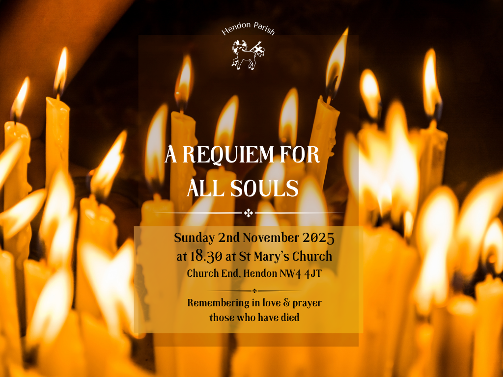 All Souls Requim Service All are warmly invited to attend the Requim for All Soults on Sunday 2nd November - 6.30 pm at St Mary’s. Remembering in love and prayer those who have died. This reflective service offers an opportunity to commend to God, in love and prayer, the souls of all who have died, and to find comfort in the hope of eternal life.If you wish to have a name included among those remembered, please send details by email to hendonparish@gmail.com, with the subject line “All Souls.”